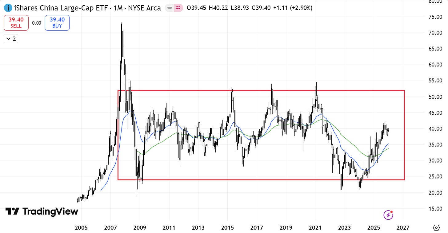 China is still within its 20-year sideways price action, but for the first time, the moving averages are now trending upwards.
