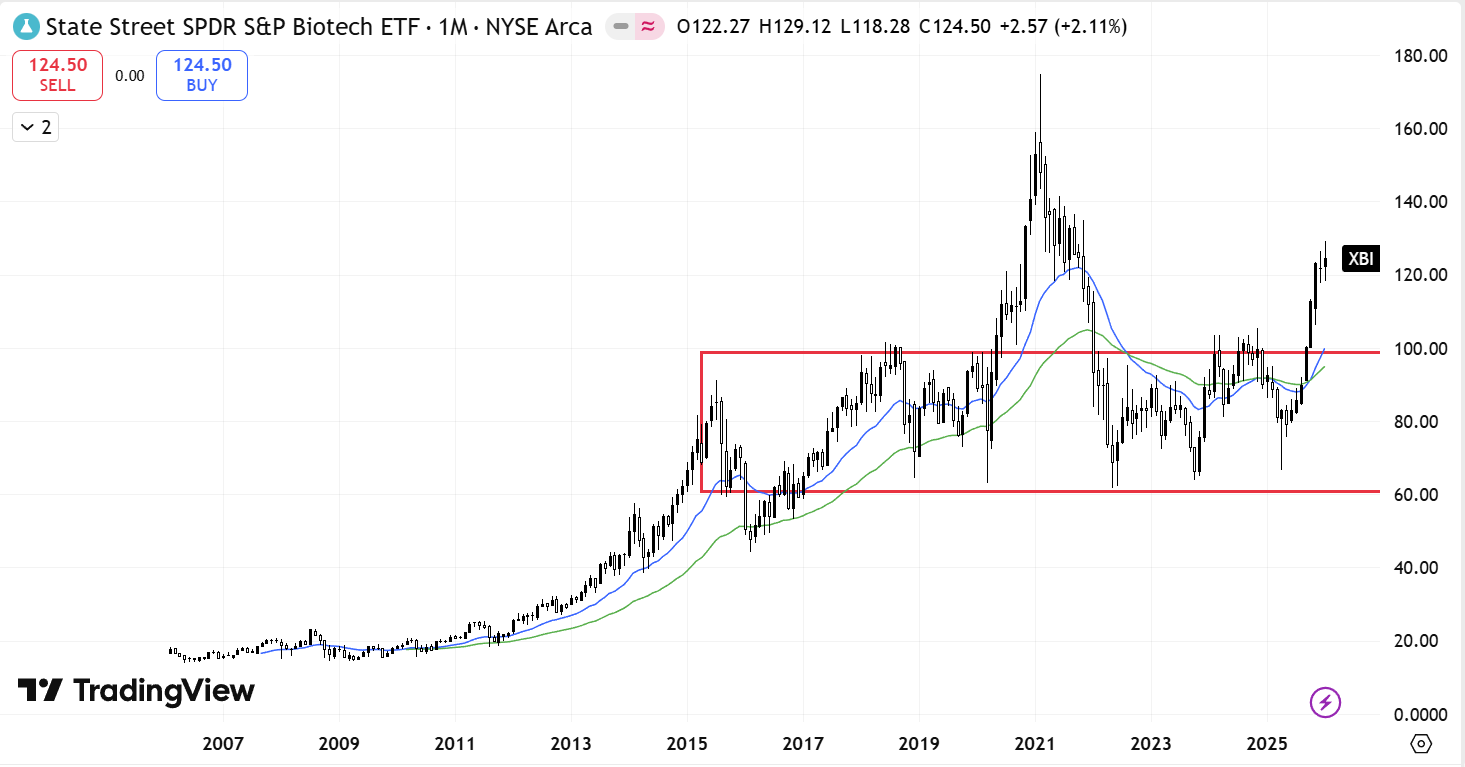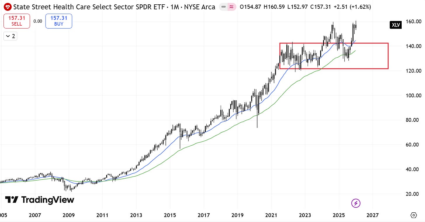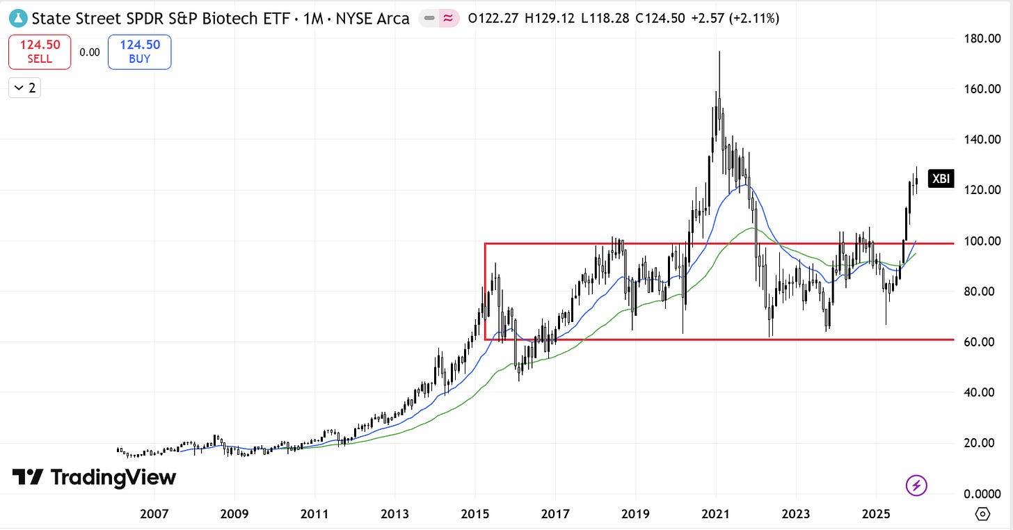 You can see in the charts that the broader healthcare market has been consolidating for 5 years and looks close to breaking out, while the biotech sector (high-beta, more volatile) broke out of a 4-year price consolidation (maybe even a 10-year consolidation if you’re not too picky).