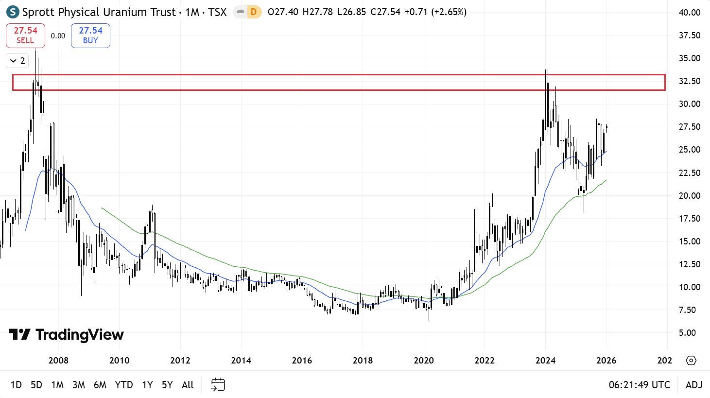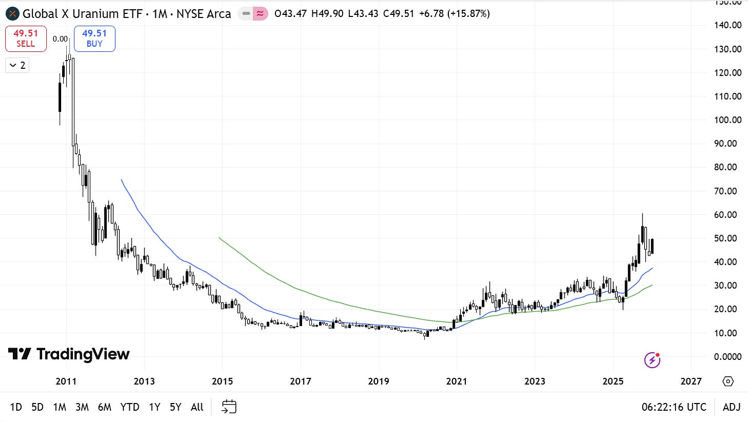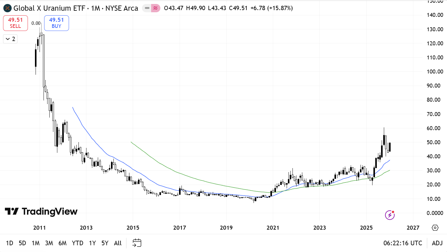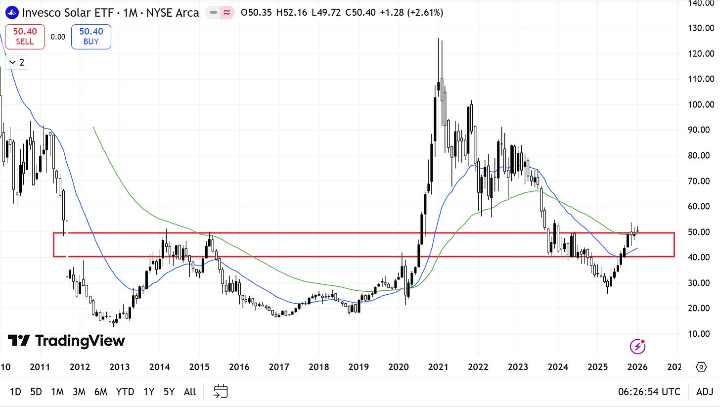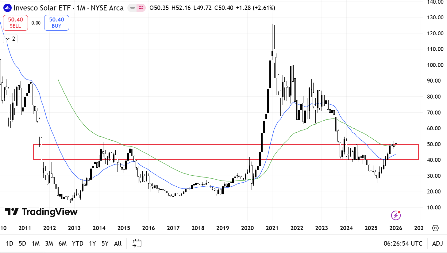 In terms of price (looking at the Solar ETF), it’s just creeping above the moving averages and trying to overcome a historically critical level. It may chop around, especially as the market figures out the interest rate path with the new Fed chair and midterms, but the upside reward here presents a great opportunity.
