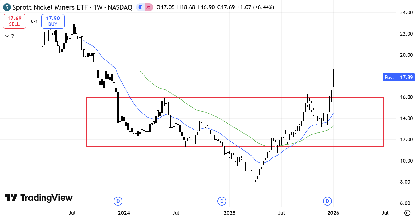 In technical terms, Nickel miners are breaking out of a 2-year price consolidation and are well above the weekly moving averages.