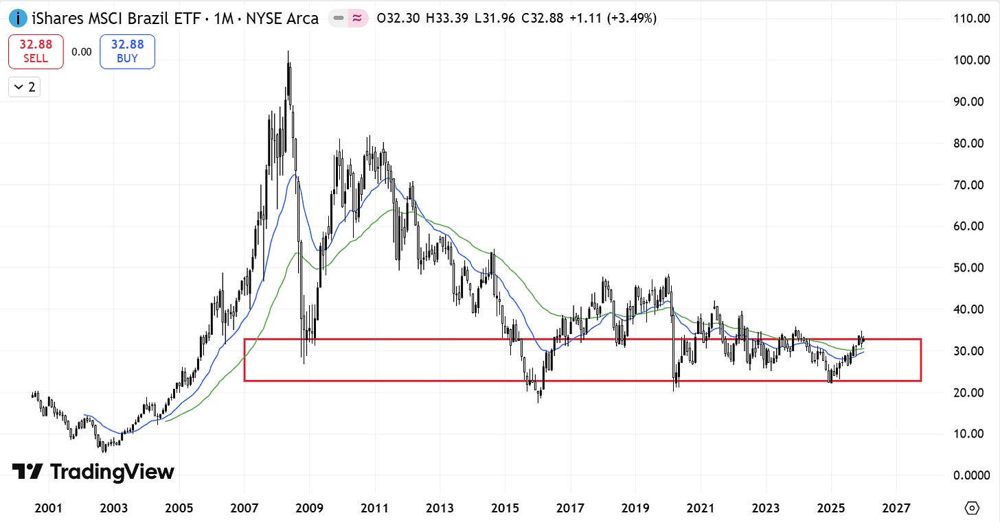 In terms of the charts, Brazil is coming out of a decade-long consolidation and has considerable room to even reach its all-time high price.