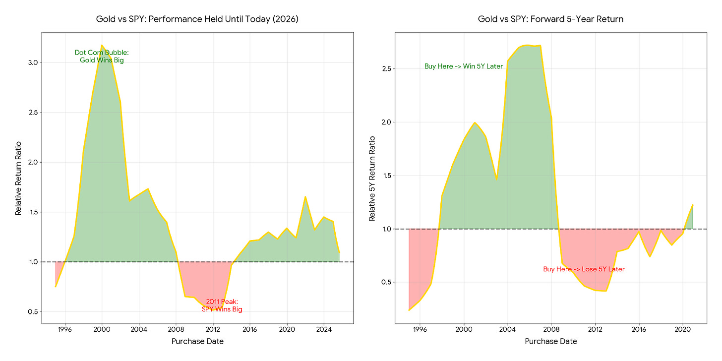 Btw, counter to popular opinion, Gold has been a better long-term investment than US equities for most of the past 30 years (left chart), while also becoming a good medium-term investment recently (right chart).