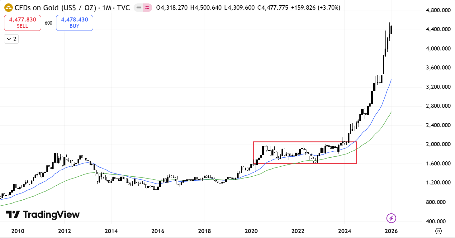 From a technical perspective, Copper also looks set to follow Gold and Silver. Price has been consolidating for 5 years above the moving averages and is now breaking out, similar to how Gold behaved the past 2 years.